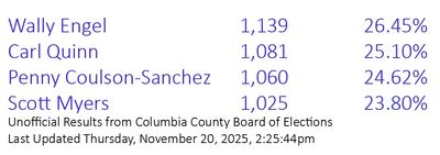 I encourage residents to write to the Town Board in support of honoring the results of the November 4th election. Penny Coulson-Sanchez received the third-highest number of votes, and in my view, she should be appointed to fill the vacancy.